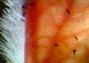 ワンちゃん、ネコちゃんの目の周りや、耳に寄生していることが多いです。