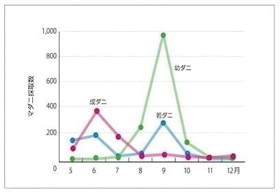 以下のグラフのように、 秋から冬にかけて幼ダニ・若ダニが活動します。