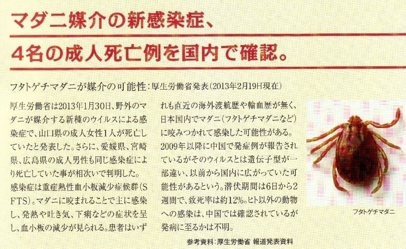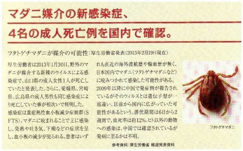 ダニに咬まれ死者が出たSFTSという感染症の報告は 1月から報道されるようになりましたね。